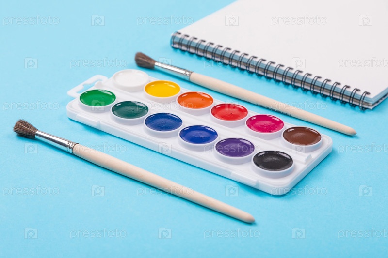 Акварельные краски и кисть с альбомом для рисования на синем фоне