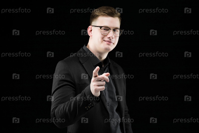 Портрет уверенного красивого элегантного ответственного бизнесмена, улыбающегося с табличкой на черном фоне