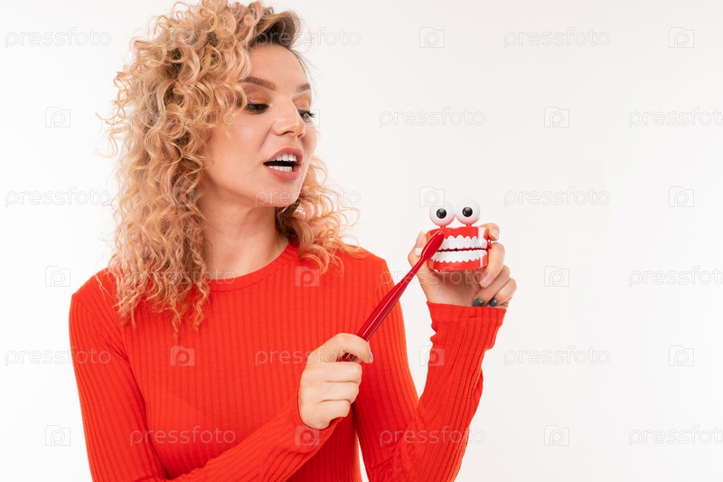 Привлекательная кудрявая европейская девушка в красном платье держит в руках зубную щетку на белом фоне