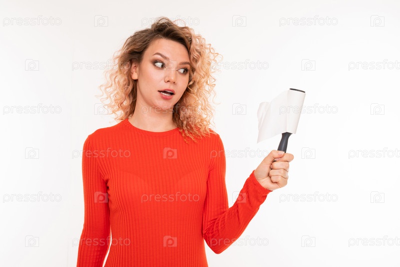 Удивленная блондинка чистит одежду от шерсти на белом фоне