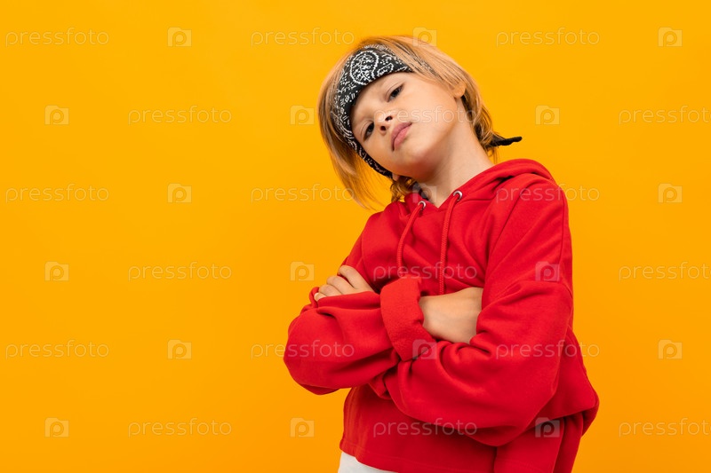 Блондин с банданой на голове в красном свитере позирует на оранжевом фоне