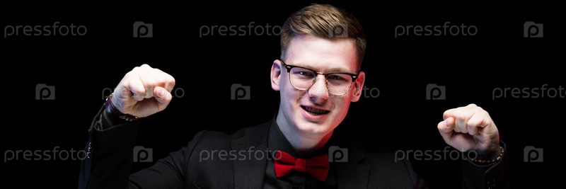 Портрет уверенного в себе красивого взволнованного счастливого элегантного ответственного бизнесмена, показывающего кулаки как концепцию успеха на черном фоне