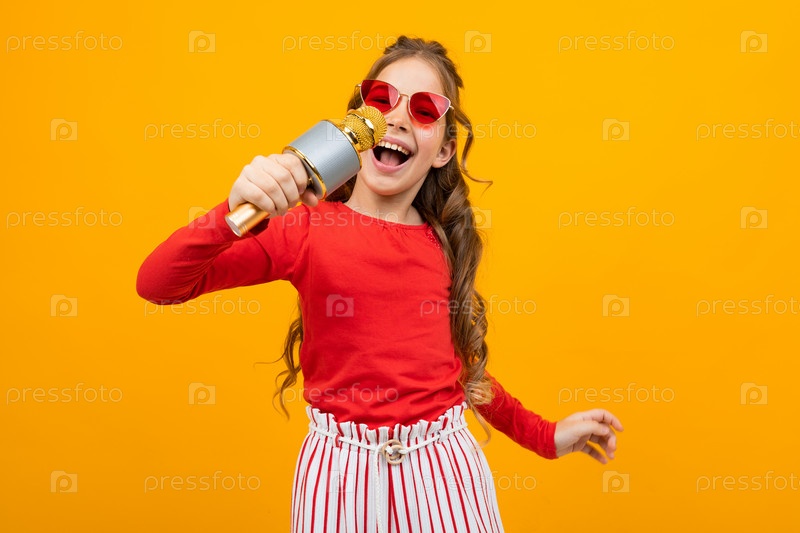 Привлекательная европейская девушка в солнечных очках поет с микрофоном на желтом фоне