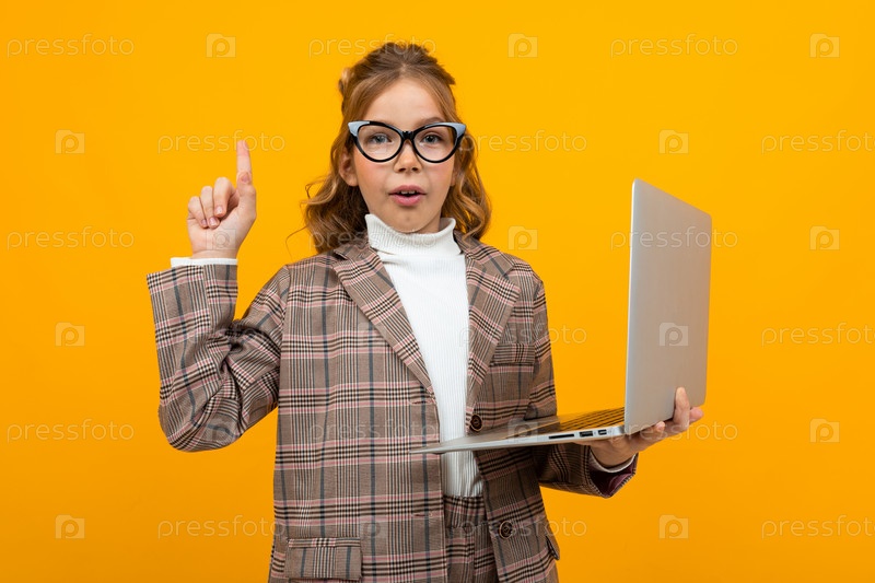 Серьезная умная школьница в очках в деловом костюме и куртке с ноутбуком в руках на оранжевом фоне