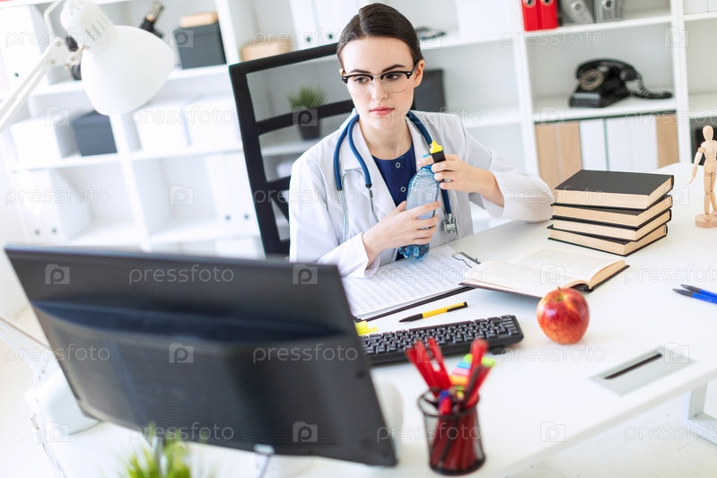 Красивая молодая девушка в белом халате сидит за компьютерным столом, держит в руке маркер и открывает бутылку с водой