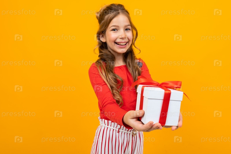 Улыбающаяся красивая девушка протягивает коробку с подарком на день рождения на желтом фоне