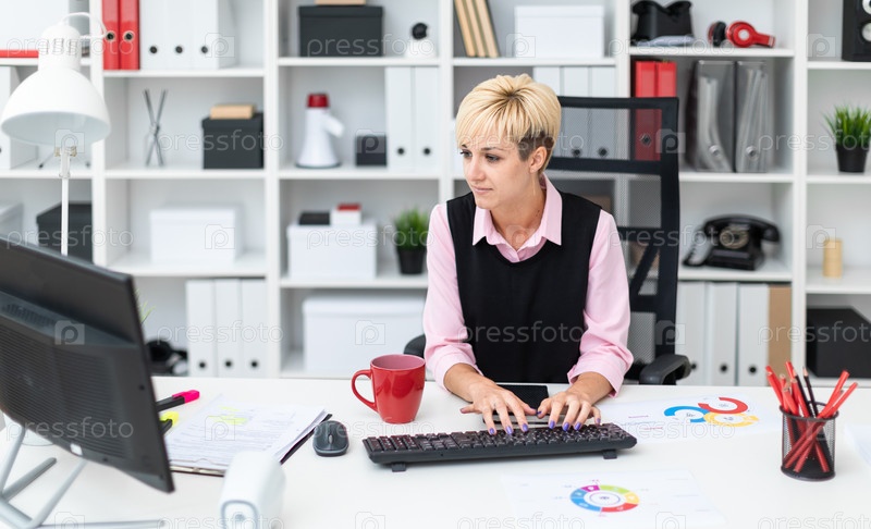 Девушка работает в офисе за компьютером