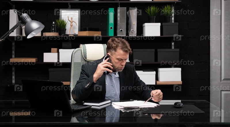 Молодой человек в деловой одежде работает за компьютерным столом с телефоном и документами