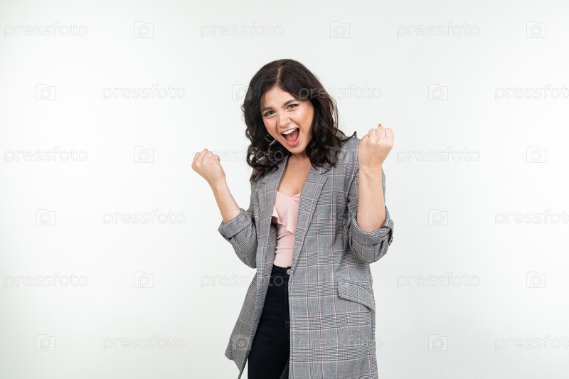 Радостная девушка в классической серой куртке прыгает от счастья на белом фоне