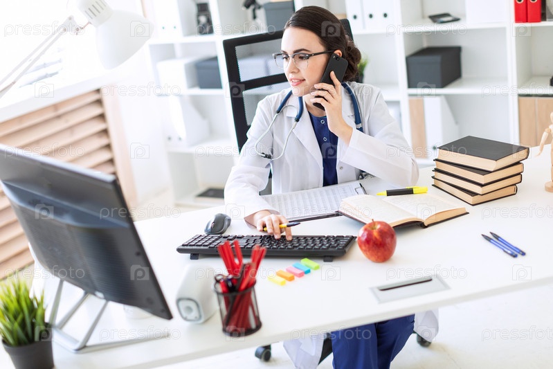 Красивая молодая девушка в белом халате сидит за столом, разговаривает по телефону и держит руку на клавиатуре