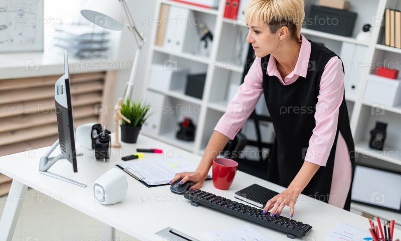 Молодая девушка стоит возле стола в офисе и печатает на клавиатуре