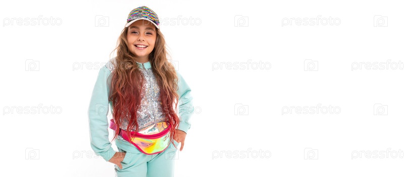 Маленькая красивая кавказская девушка в спортивном костюме, панорама на белом фоне