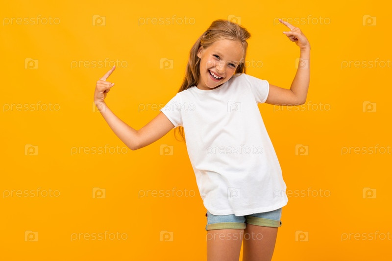 Красивая девушка с длинными волосами улыбается, изображение на желтом фоне