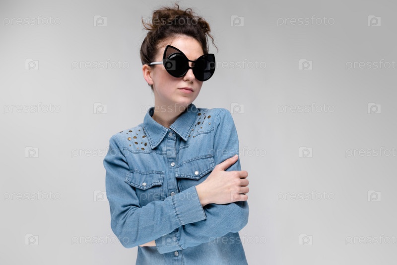 Молодая брюнетка в черных очках. Кошачьи очки. Волосы собраны в пучок. Девушка сложила руки. Девушка смеется
