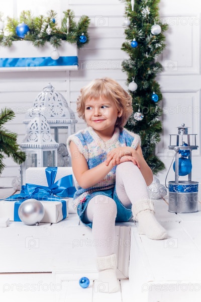 Маленькая улыбающаяся девочка сидит рядом с елкой и рождественскими игрушками