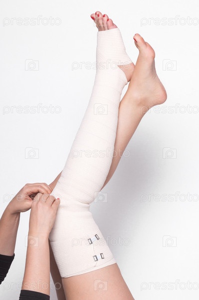 Девушка на белом фоне поправляет эластичную повязку, которая связала ее ногу