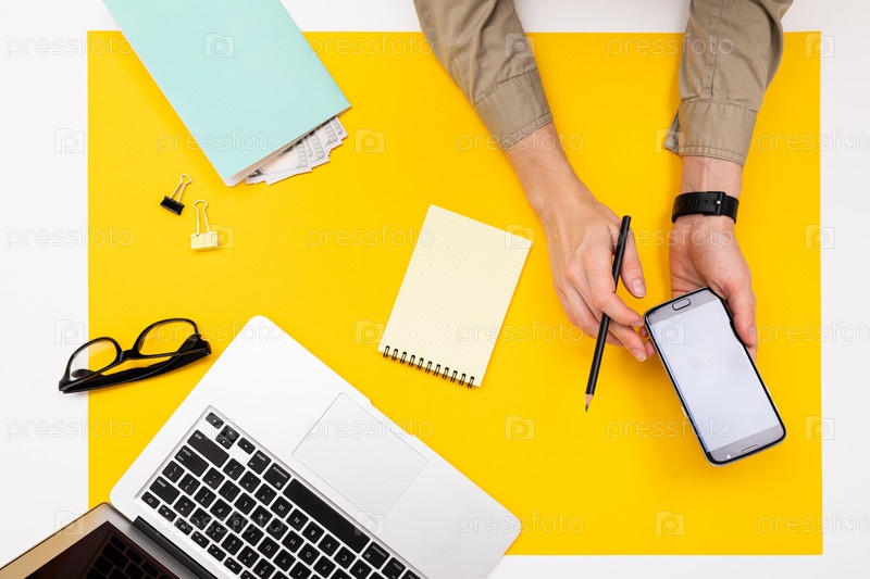 Офисное рабочее место. вид сверху на ноутбук, очки и ноутбуки с деньгами, руки с телефоном с макетом на желтой поверхности