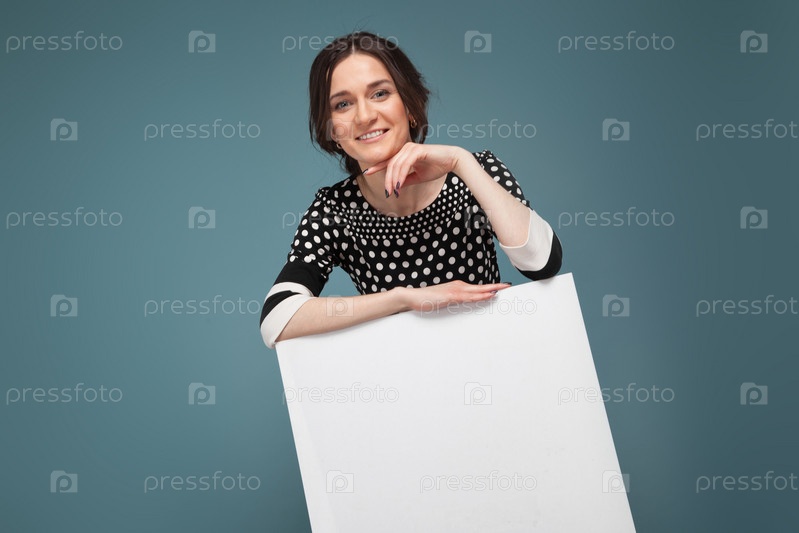 Изолированная на темно-серой, симпатичная молодая брюнетка, одетая в черное платье в горошек, стоит и держит пустой плакат, опирается на плакат, рука об руку