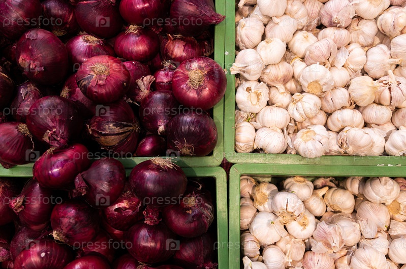 Органические головки чеснока слева и фиолетовые луковицы справа на фото. Овощной фон, вид сверху, плоский