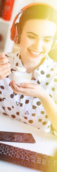 Красивая молодая девушка в белой блузке с геометрическим узором и синих джинсах. Девушка с темными волосами и красивым макияжем. Очаровательная молодая девушка работает в светлом офисе. фото с глубиной резкости