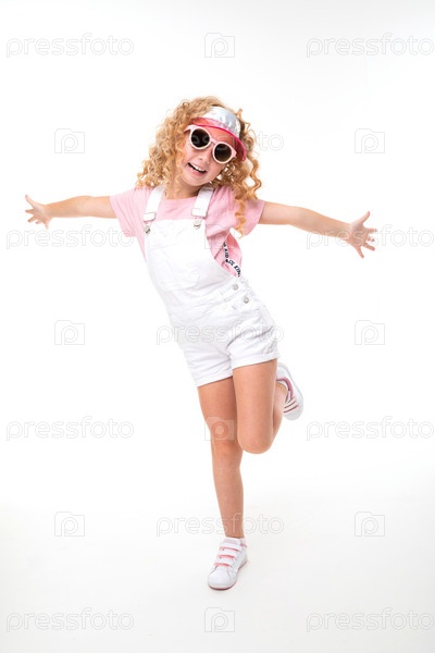 Сумасшедшая европейская девушка в солнечных очках на белом фоне