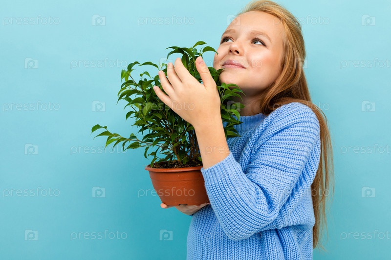 Веселая харизматичная девушка в синем свитере нюхает цветы на синем фоне