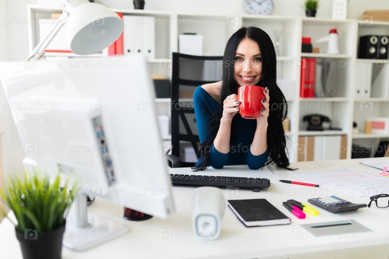 Красивая молодая девушка работает в ярком офисе. фото с глубиной резкости