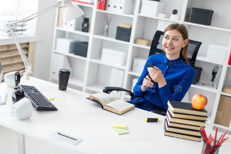 Красивая молодая девушка в синей рубашке работает в ярком офисе. фото с глубиной резкости