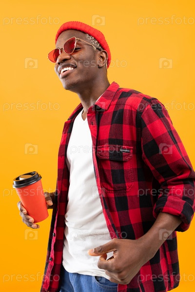 Портрет чернокожего американца, стильно одетого, держащего стакан напитка на желтом фоне кофе-брейка