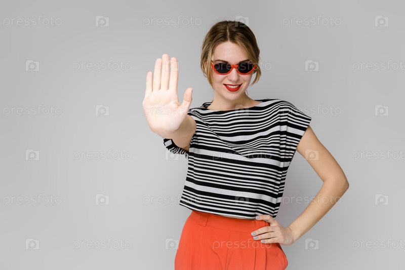 Молодая девушка в очках на сером фоне. Девушка в полосатой кофточке и оранжевых штанах