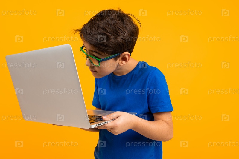 Умный мальчик в синей футболке аккуратно печатает на ноутбуке на желтом студийном фоне