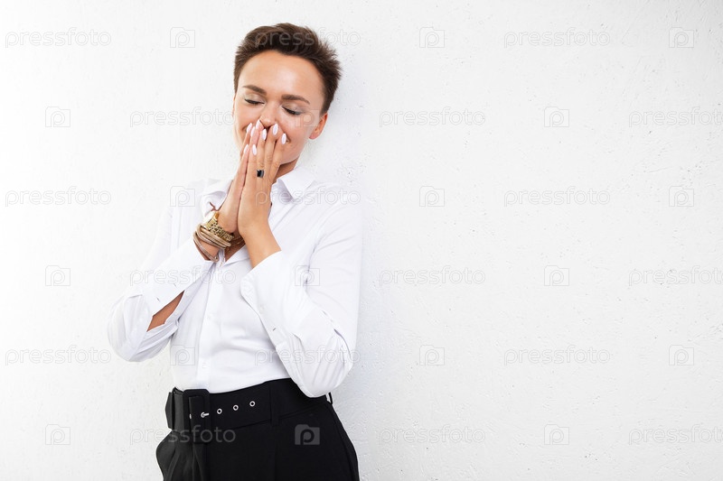 Веселая офисная леди в белой рубашке и черных брюках беспокоится о работе, изолированная на белом фоне