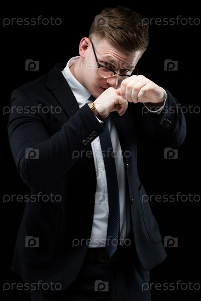Портрет уверенного в себе красивого амбициозного элегантного ответственного бизнесмена, боксирующего на черном фоне