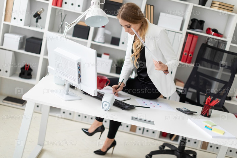 Красивая молодая девушка со светлыми волосами в белой куртке и черной блузке работает в офисе. фото с глубиной резкости