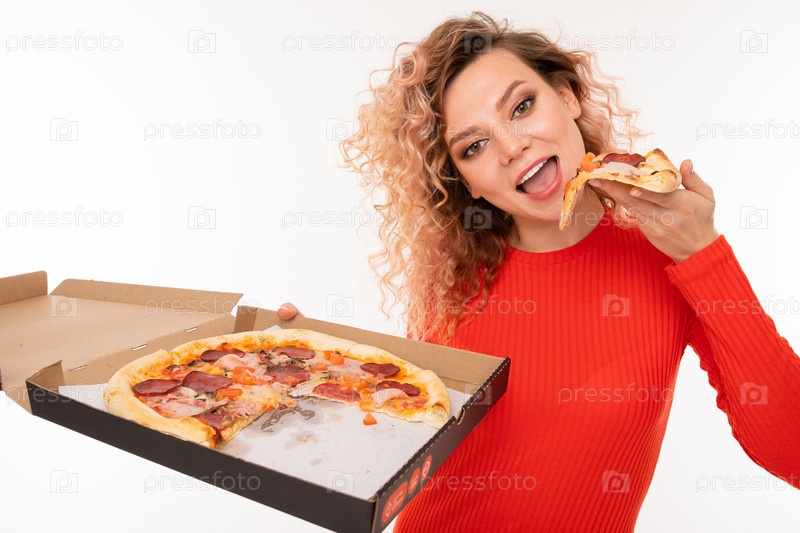 Привлекательная кудрявая блондинка пробует кусок пиццы, держа коробку в руке на белом фоне