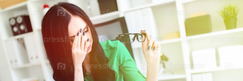 Красивая девушка в зеленой блузке и белых брюках сидит за офисным столом. фото с глубиной резкости