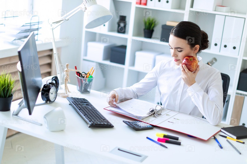 Красивая маленькая девочка в белой блузке и черной юбке. Девушка с темными волосами и красивым макияжем. Очаровательная молодая девушка работает в светлом офисе. фото с глубиной резкости