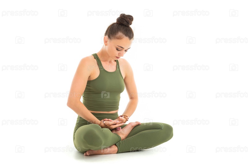 Красивая молодая гимнастка с темными длинными волосами, собранными в пучок, в зеленом спортивном эластичном костюме сидит и расслабляется