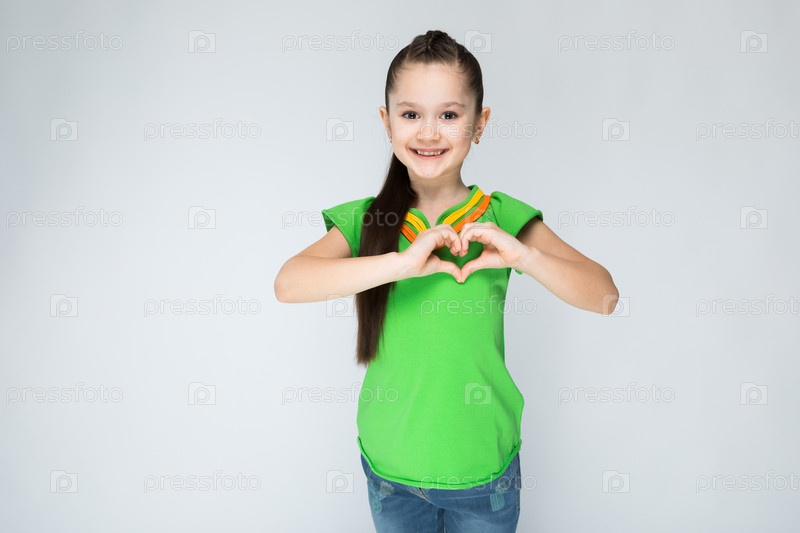 Девушка в зеленой футболке и синих джинсах на сером фоне