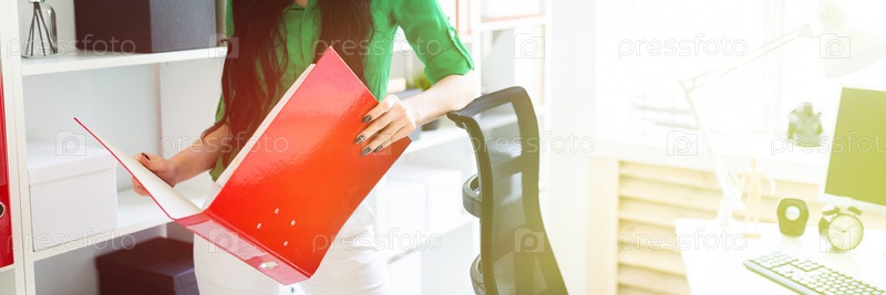 Красивая девушка в зеленой блузке и белых брюках стоит возле полок с документами. фото с глубиной резкости