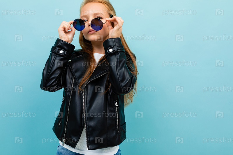 Нахальная европейская девушка в очках на светло-голубой стене