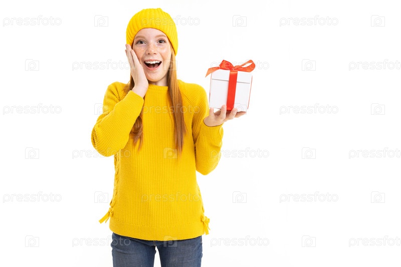 Счастливая рыжеволосая девушка с коробкой, перевязанной лентой на белом фоне