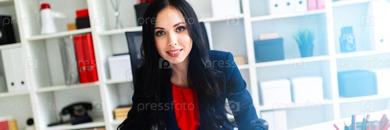 Портрет молодой девушки в костюме. Красивая девушка работает в офисе