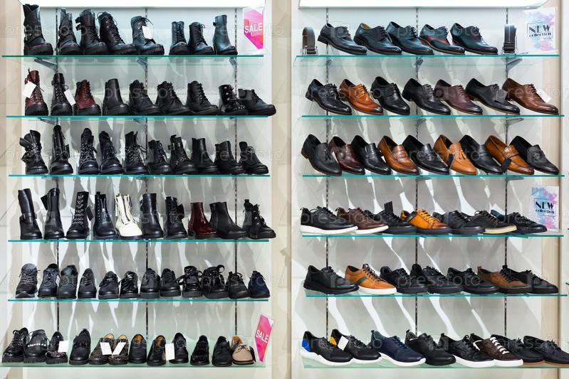 Витрина с полками с туфлями и ботинками для женщин и мужчин
