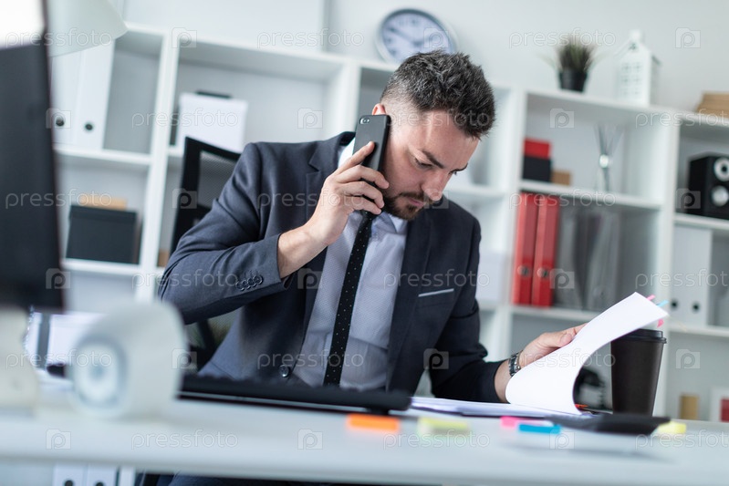 Мужчина сидит в кабинете за столом, разговаривает по телефону и листает документы