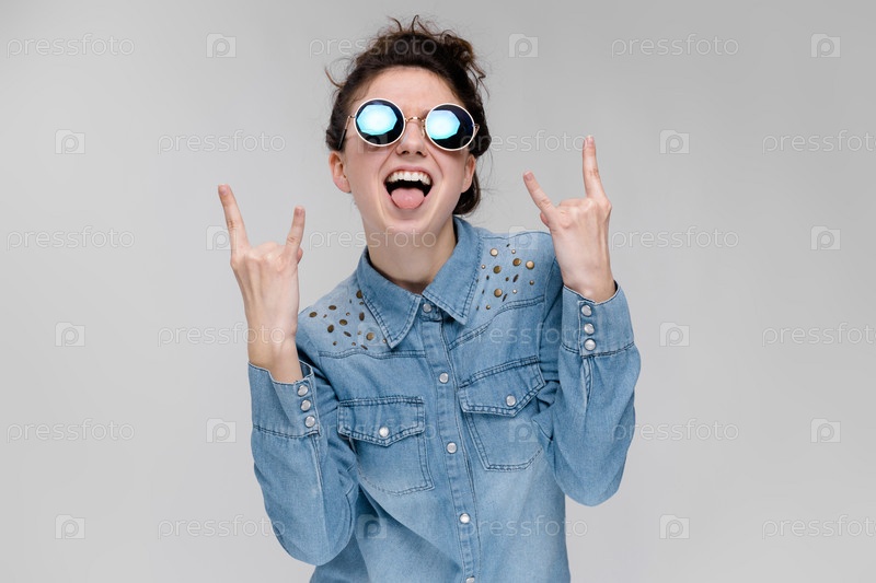Молодая девушка в круглых очках на сером фоне. Портрет молодой красивой девушки. Очаровательная девушка в синей джинсовой рубашке