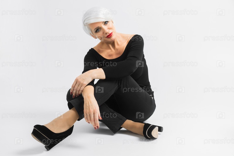 Блондинка-бизнесвумен средних лет позирует в студии на сером фоне