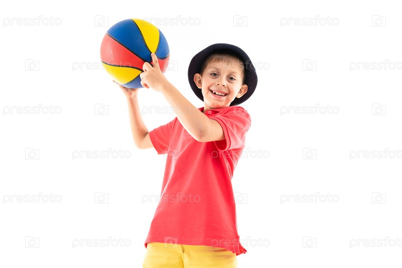 Маленький мальчик в панаме, желтой майке, красных шортах и белых кроссовках стоит с баскетбольным мячом