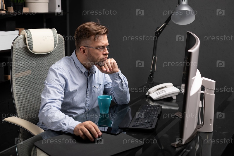 Респектабельный мужчина с щетиной на лице в мятой рубашке и джинсах работает в стильном офисе за компьютером. Бизнесмен сидит за компьютером, а перед ним синяя кружка. предприниматель подпер подбородок рукой и работает за компьютером