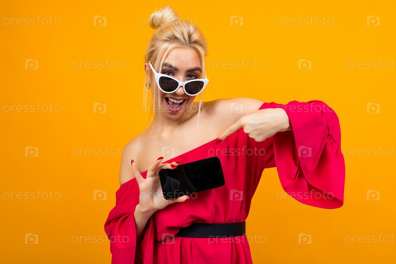 Блондинка эмоционально веселая улыбающаяся девушка показывает пустой экран телефона с макетом на оранжевом фоне